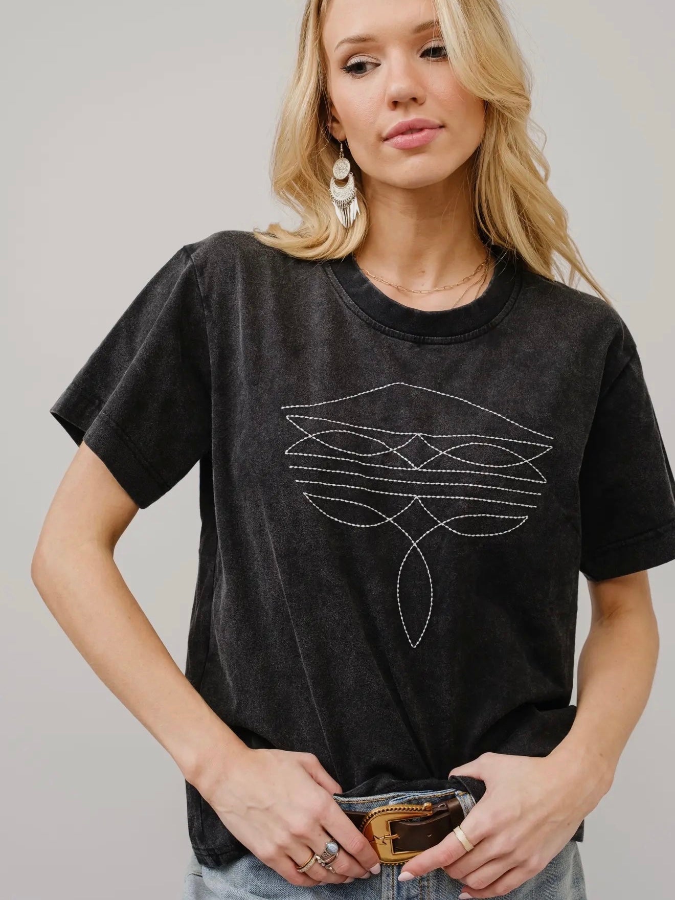 A super soft washed black graphic tee with the traditional cowboy boot embroidery on the front.