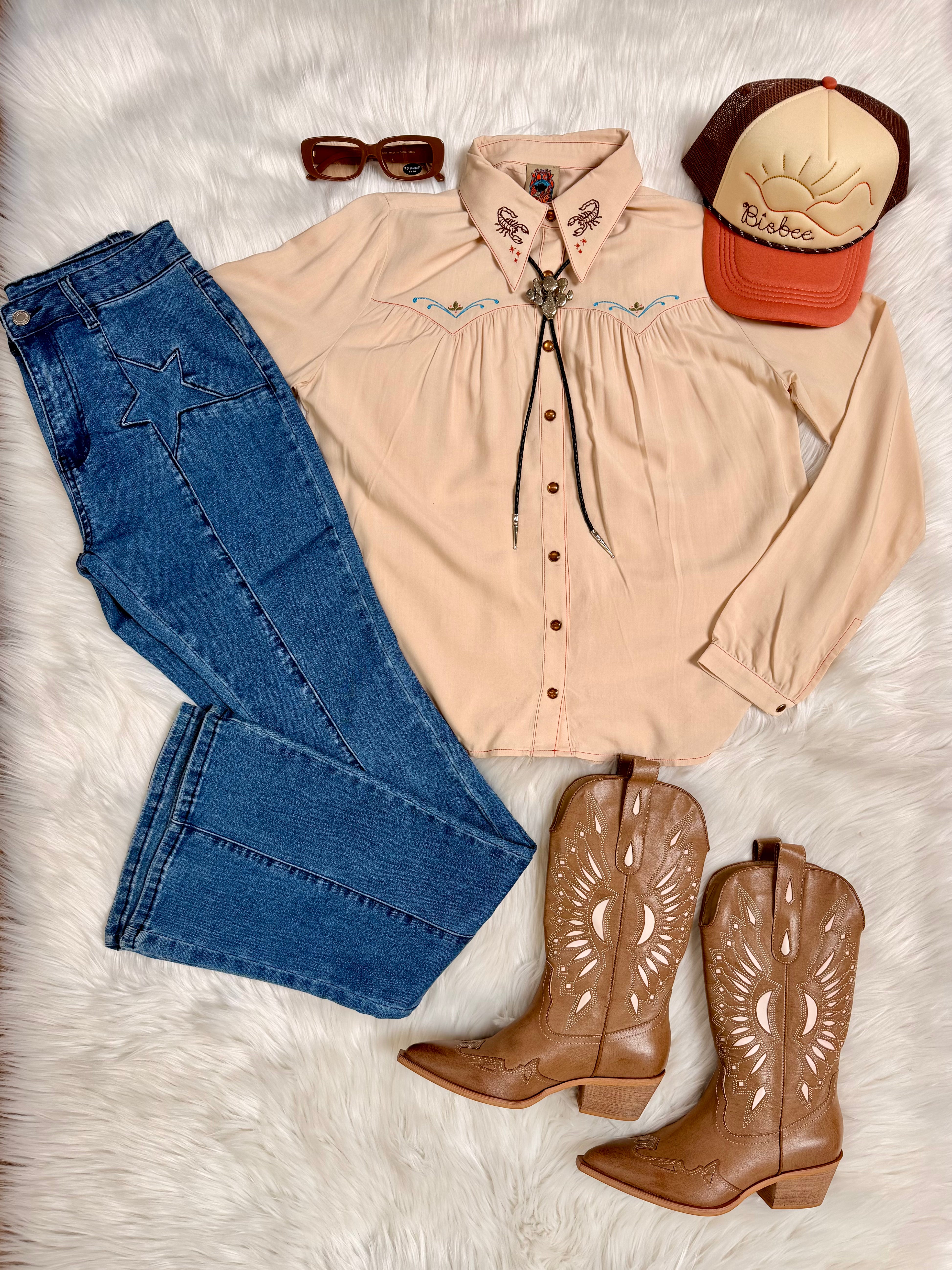 "Designed first in California, most of our products are crafted with vegan blended leather. They undergo a specialized distressing process to get the weathered look you love-- just like genuine leather, our blend gets more distress and character with wear. Stay clear of water to avoid stains. Our materials are safe to spray with water proofing protectant, but please note that some sprays will slightly alter product color." - Xoxo, Mi.iM