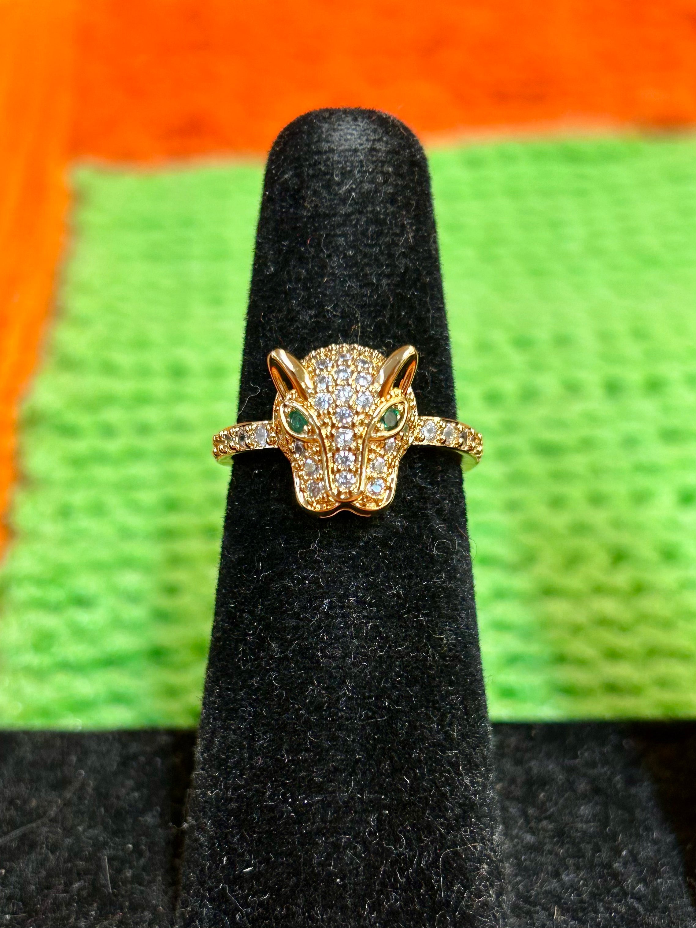 Gently adjustable gold plated ring featuring a crystal encrusted panther head. One size fits most.