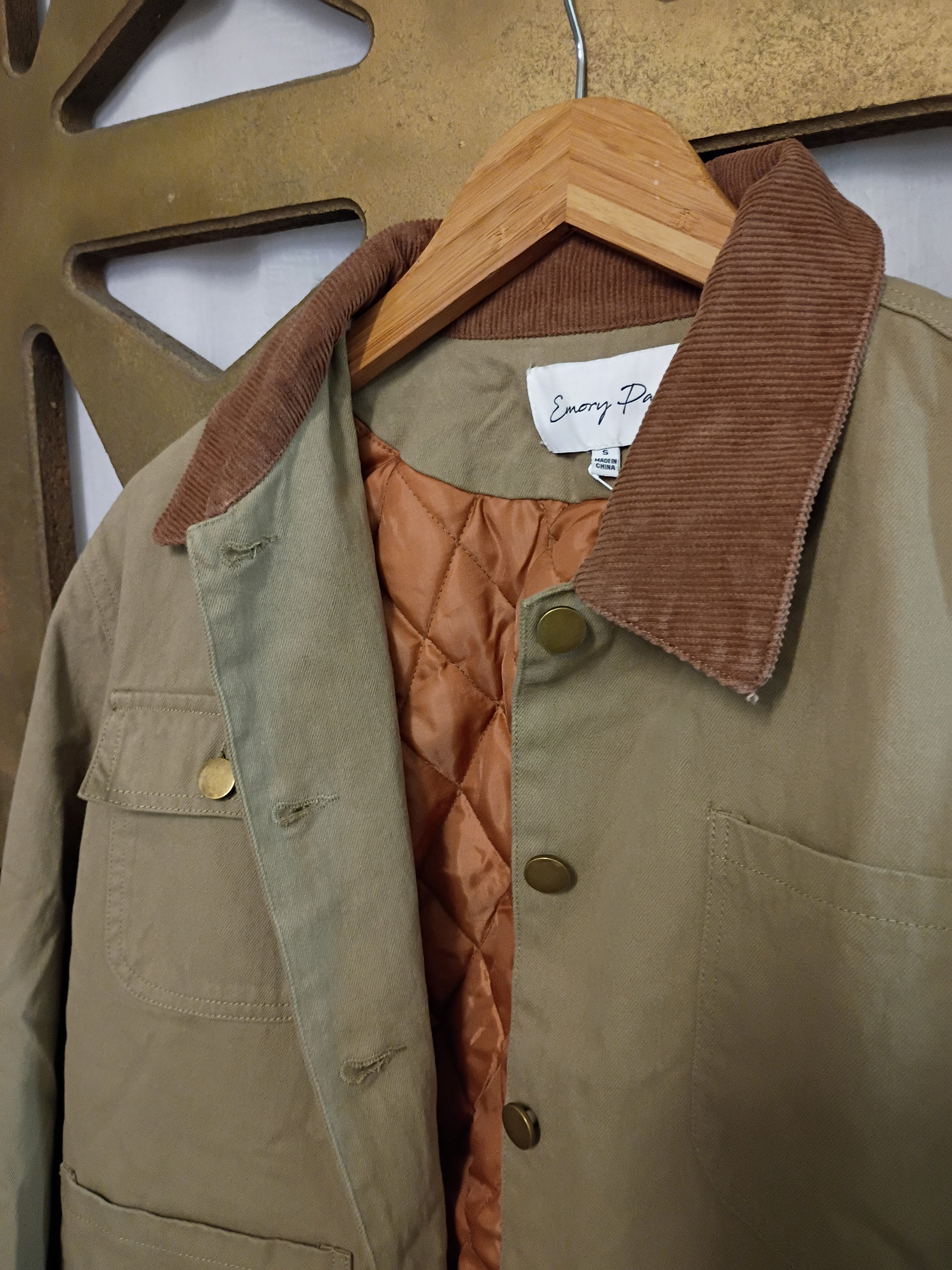 Vintage style bomber with durable khaki, lined with soft diamond pattern, and cute corduroy collar. Features a boxy fit.